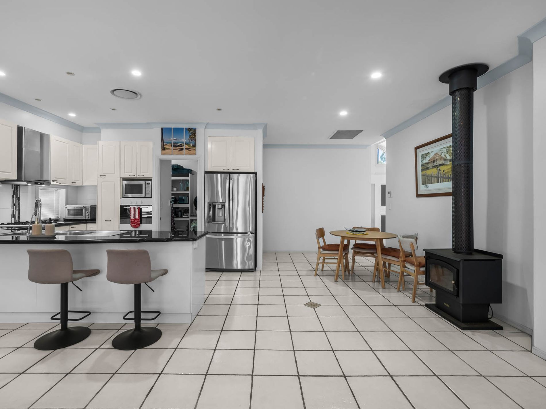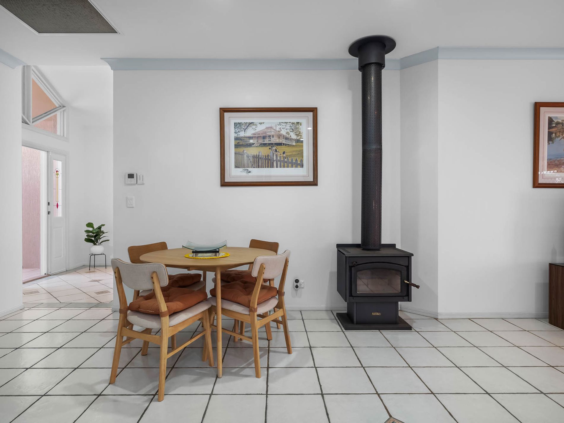 • Open plan dining and family/living area with tiled flooring and wood burning fire place and double sliding glass door to patio