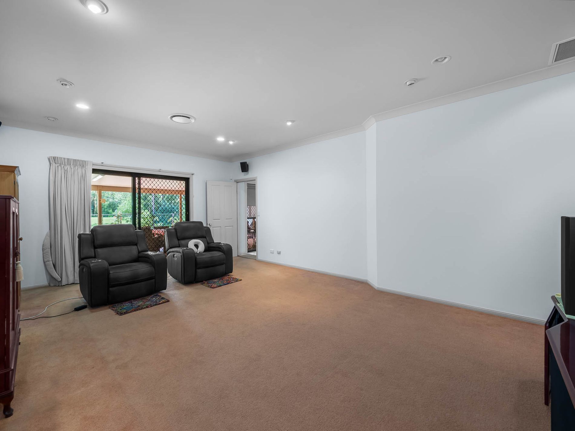 • Large media room with carpet flooring, rockwool sound proofing in ceiling and walls, rear ceiling speakers wired, tv Ariel booster in ceiling and double glazed glass sliding door to patio