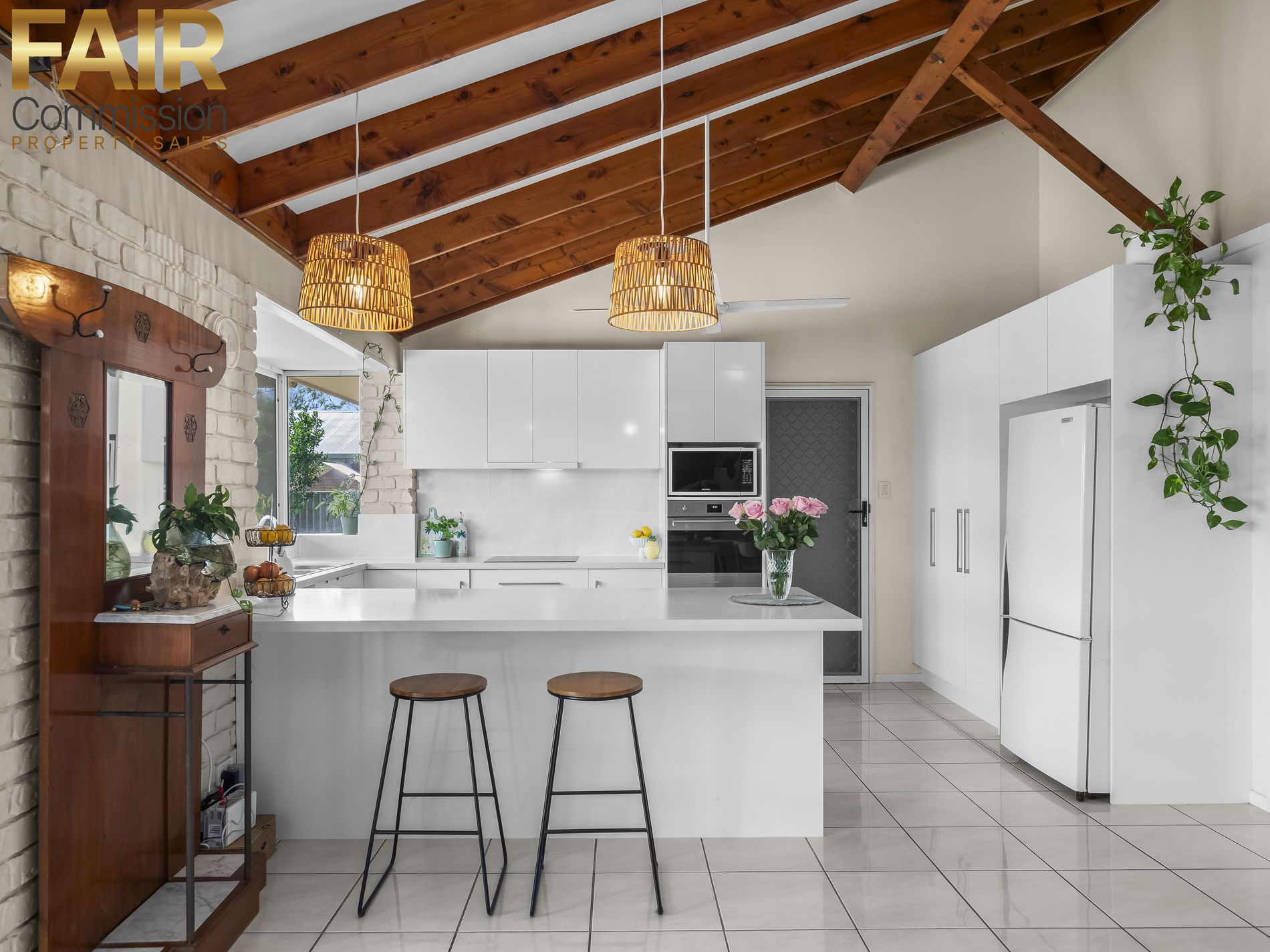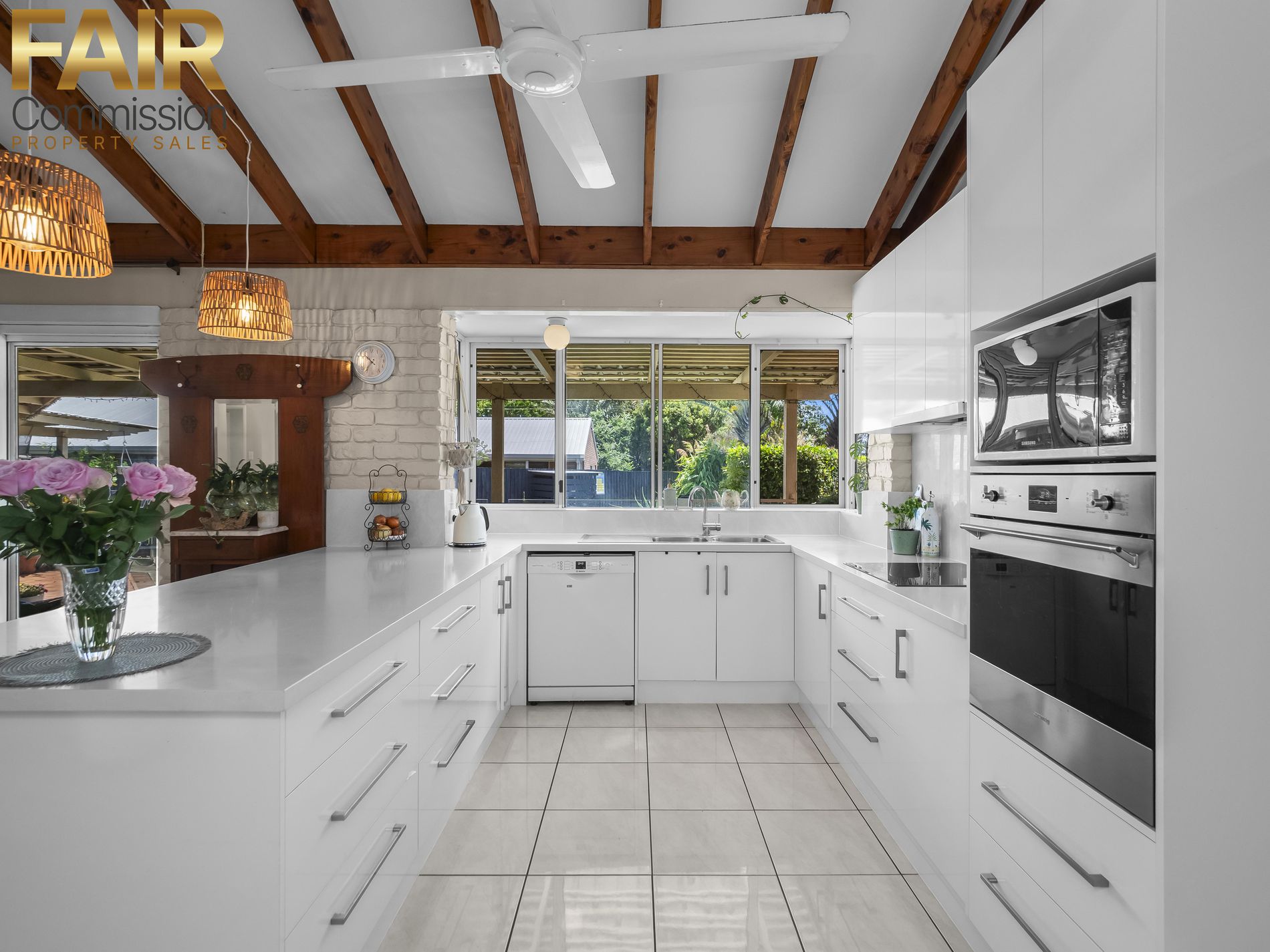 • Modern kitchen with Caesarstone benchtop, plenty of upper and lower storage cabinetry, dishwasher, electric appliances
