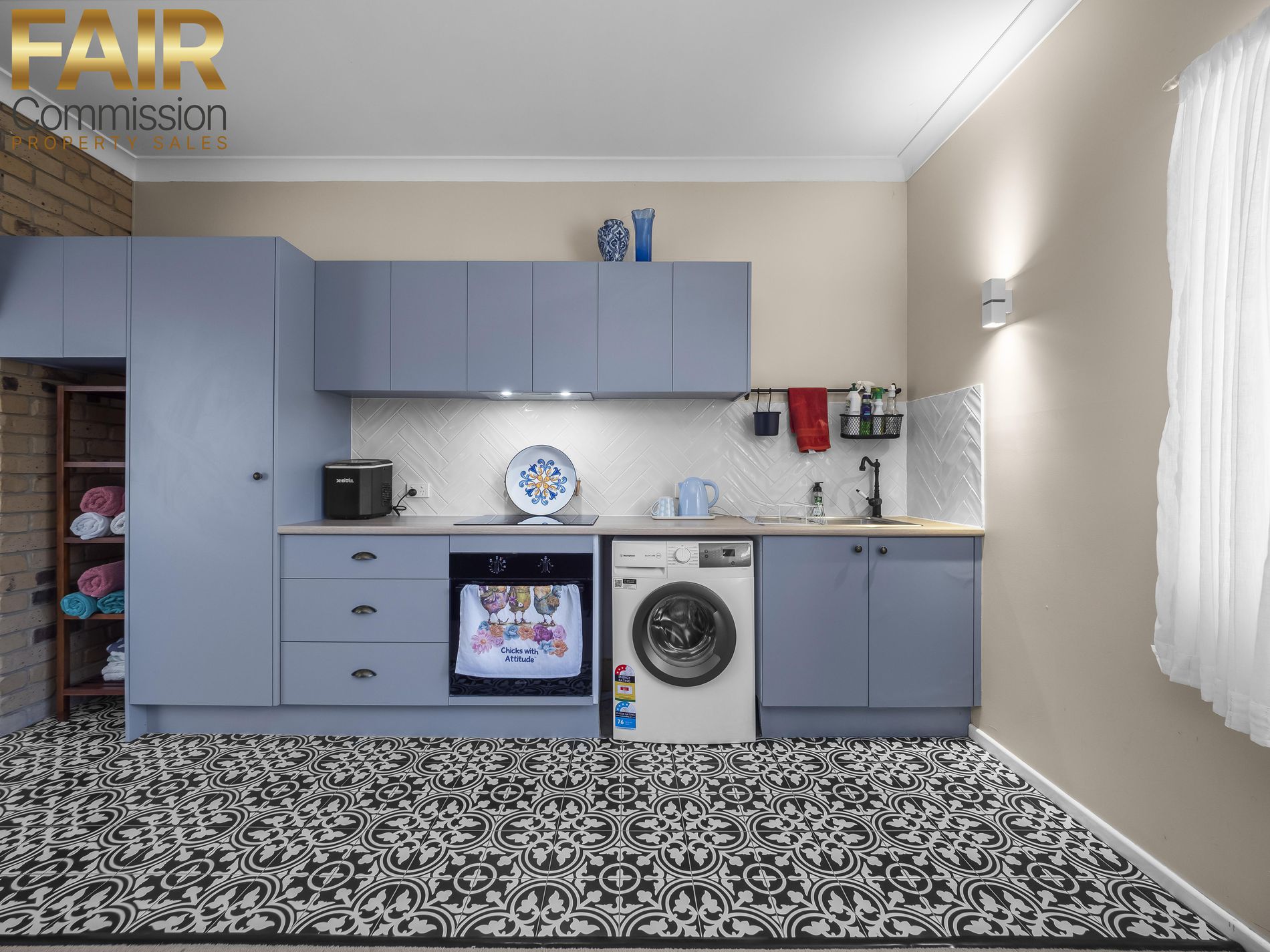 • Modern kitchen has electric cooktop, upper and lower storage cabinetry and space for washing machine