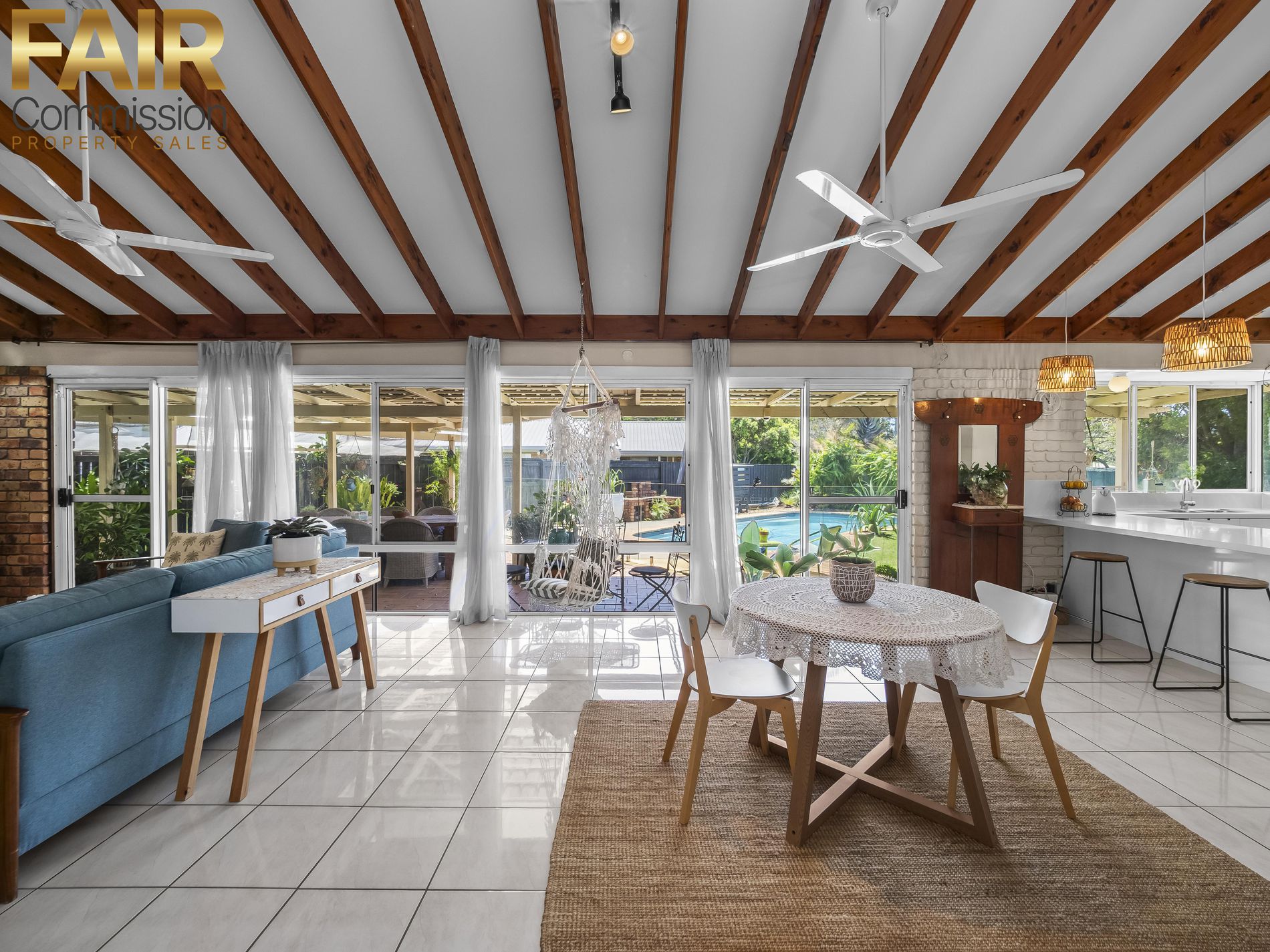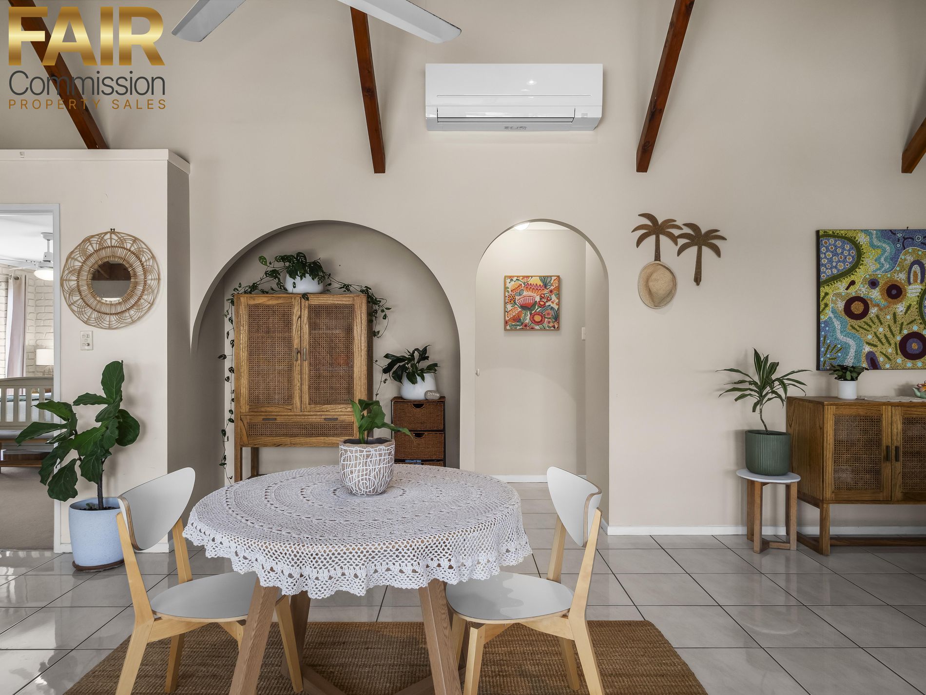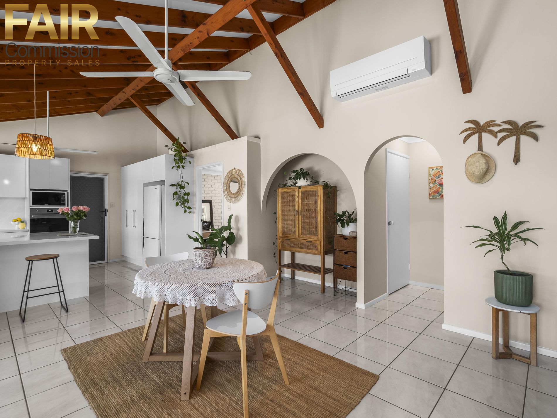 • Open plan lounge/dining with vaulted ceiling, 3 fans, air conditioning and 2 double glass doors opening to patio